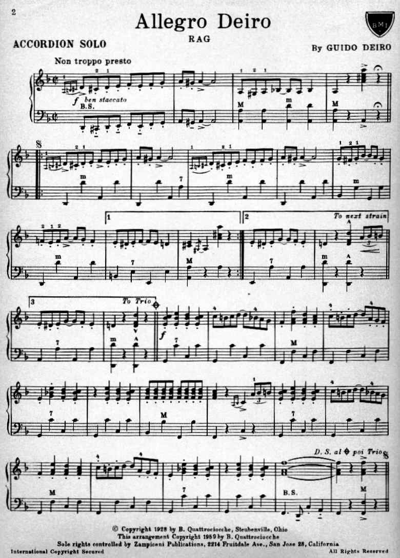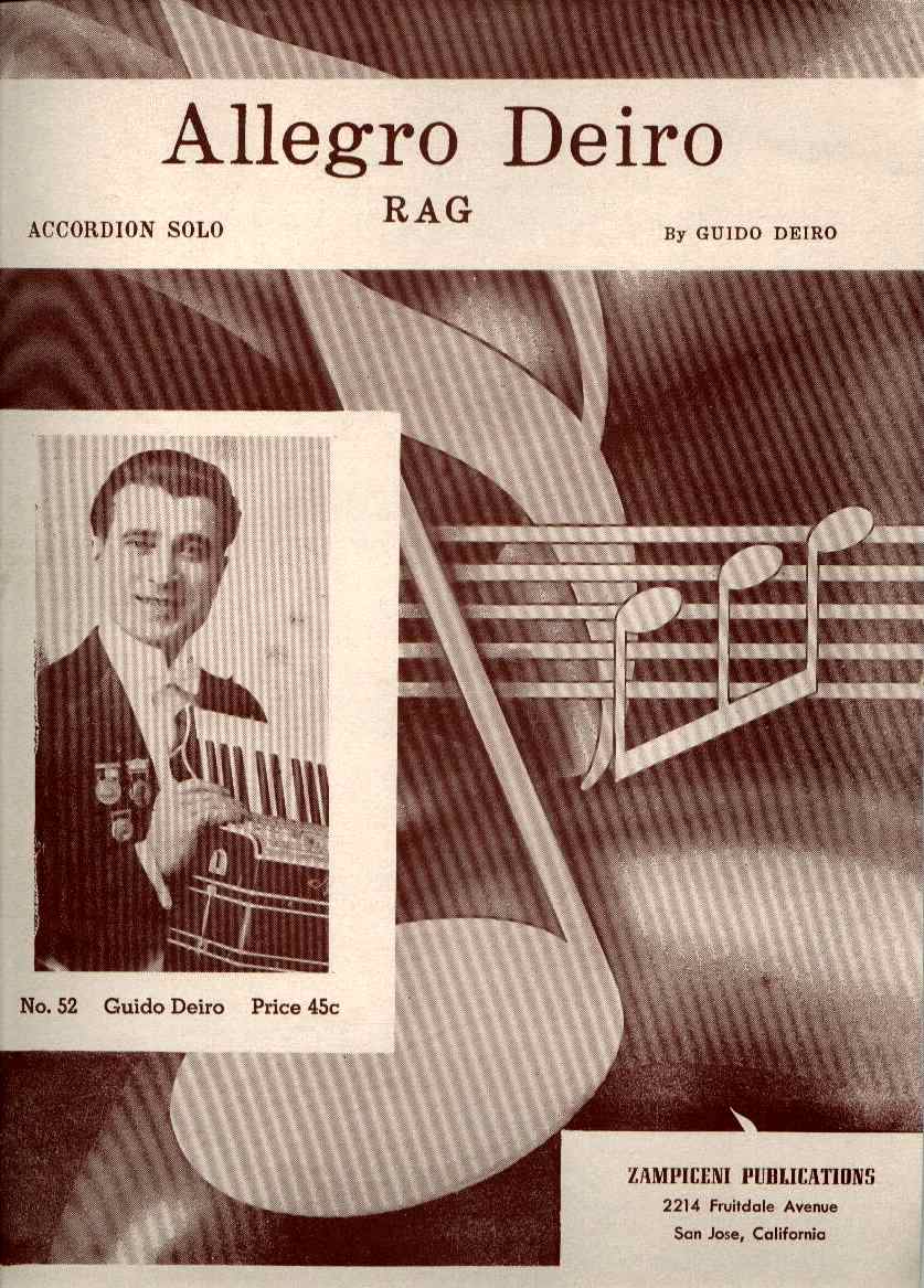 Allegro Deiro, originally known as Deiro Rag, was recorded by Guido Deiro on August 5, 1912 and released by Columbia Records. The sheet music was published in 1913 by Jerome H. Remick and Company in a piano arrangement by Herman E. Schultz.