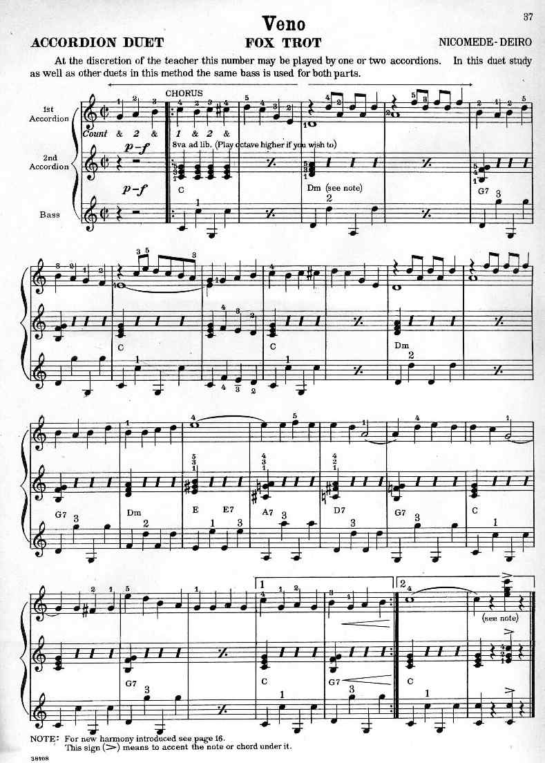 Veno Fox Trot is the first duet from Guido Deiro's Royal Method for Piano Accordion Volume I. The first accordion plays the melody and the second plays the accompaniment. This piece was co-composed by Nicomede.